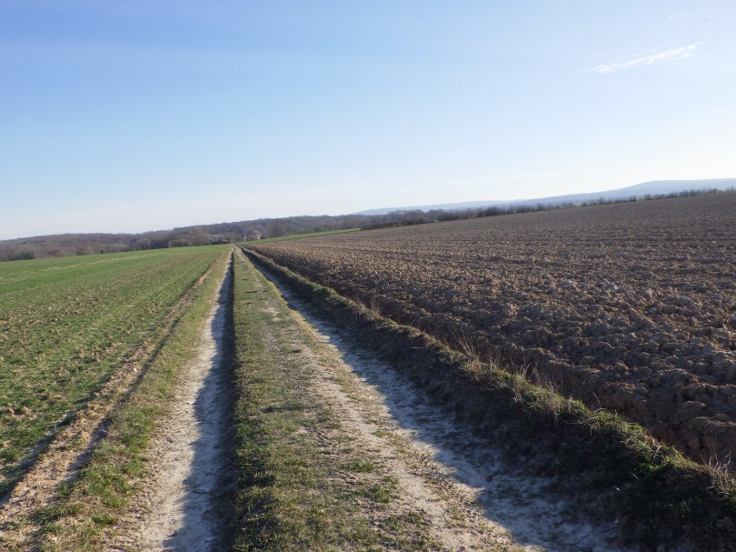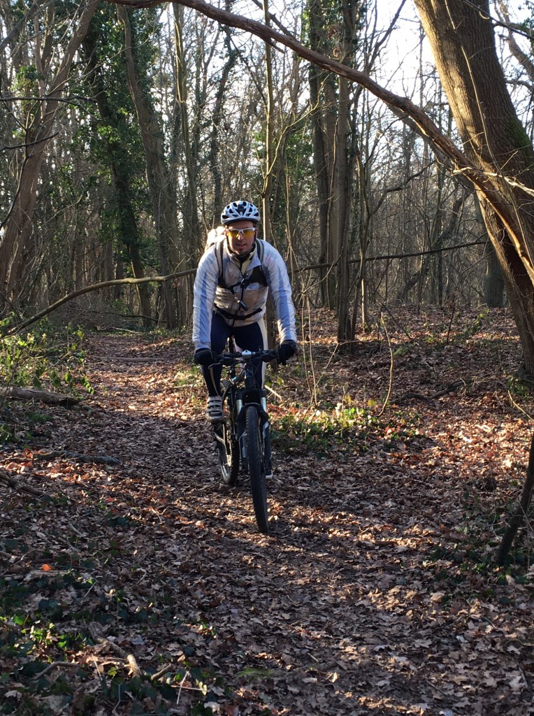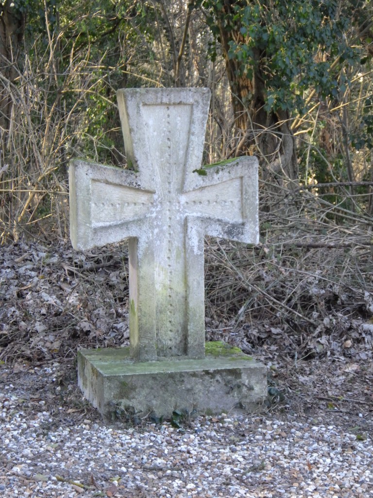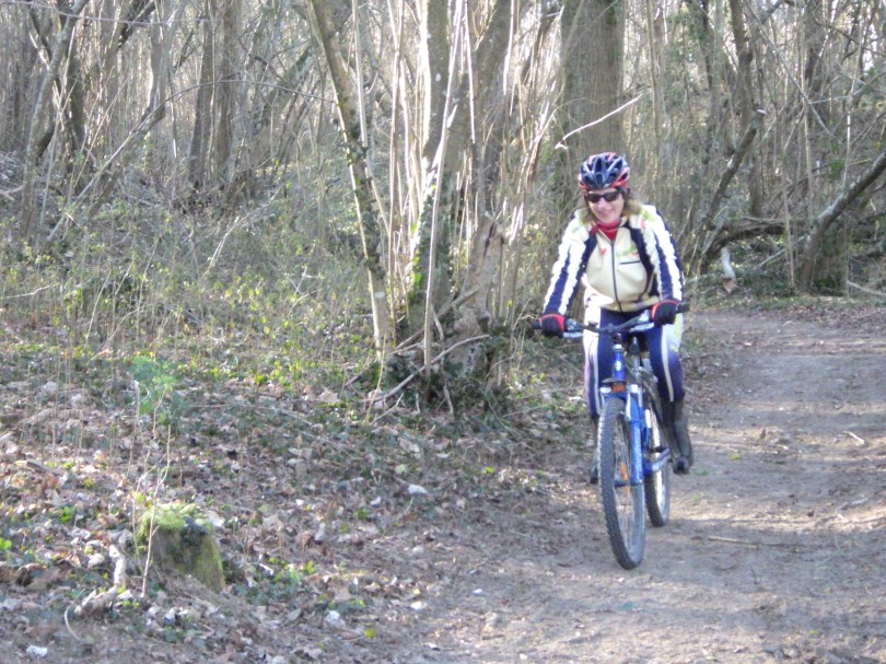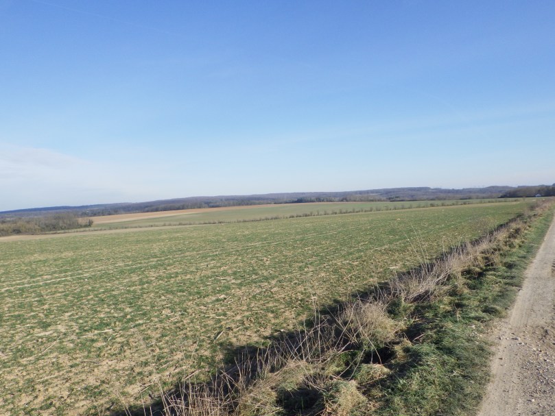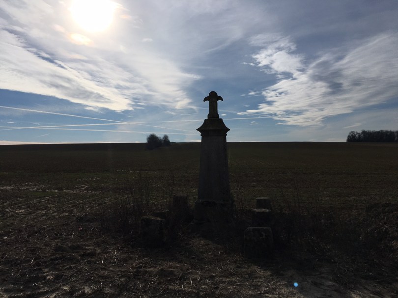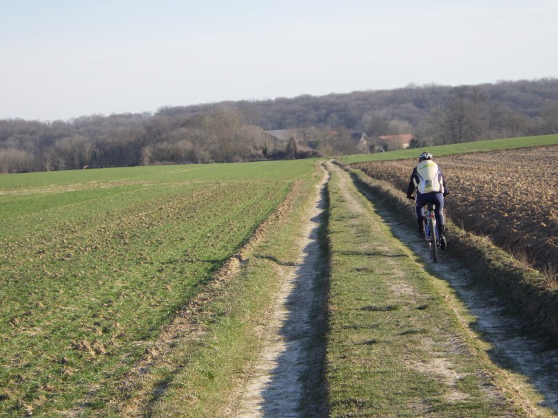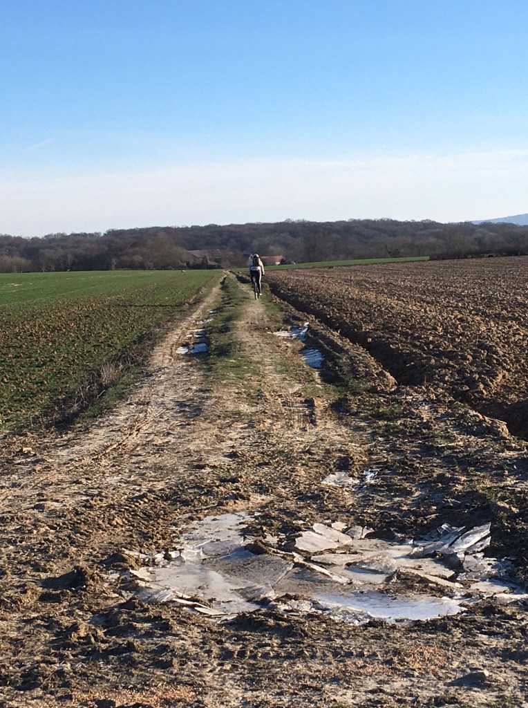 On part par l’atelier Daubigny, direction le bois des Vallées. Nous montons vers la ferme des Vallées… nous n’avons déjà plus froid !!! Puis single dans le haut du bois qui nous amène à la carrière aux coquillages : ce site géologique de l’Auversien est protégé, nous ne faisons que passer à côté… on lira les panneaux explicatifs une autre fois! Nous arrivons sur le plateau. Le froid est toujours intense, les flaques d’eau sur le chemin sont gelées : elles cassent sous nos pneus lorsqu’elles sont peu profondes mais elles résistent lorsque la couche de glace est plus importante. Gare à ne pas glisser !!! Les champs de cultures s’étendent à perte de vue, la terre des labours gelée est belle sous ce soleil d’hiver qui intensifie le bleu du ciel. On a presque chaud… mais ça ne dure pas, le froid glacial est toujours présent et le sera tout au long de notre parcours. Une horde de 5 chevreuils passe au loin, ils sautent gracieusement à travers les labours et disparaissent dans un bois plus loin… Nous descendons (à glagla !!!) sur Valmondois jusqu’à l’église puis nous prenons le chemin le long du Sausseron pour remonter dans le bois jusqu’au plateau de Parmain. 4 sangliers au loin courent à travers champs. Leur course est lourde… Puis redescente sur Nesles après le passage de 2 très belles croix dont la croix des Friches (petite croix pattée en pierre). Il faut savoir que les croix pattées sont considérées comme emblématiques du Vexin français…