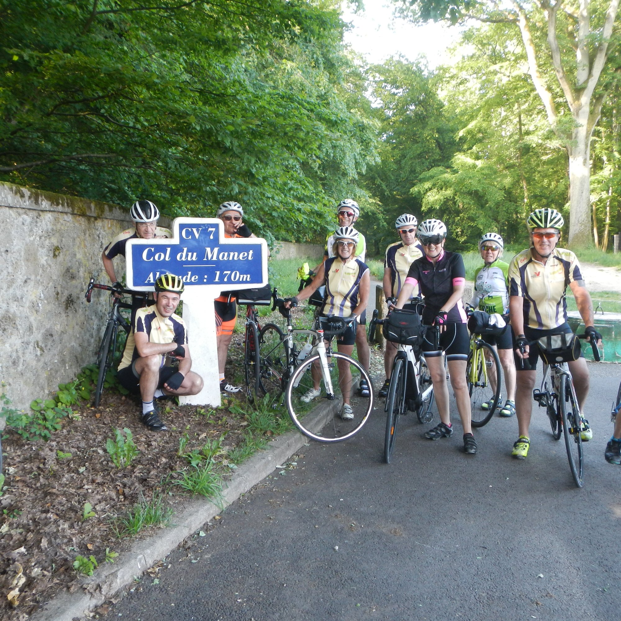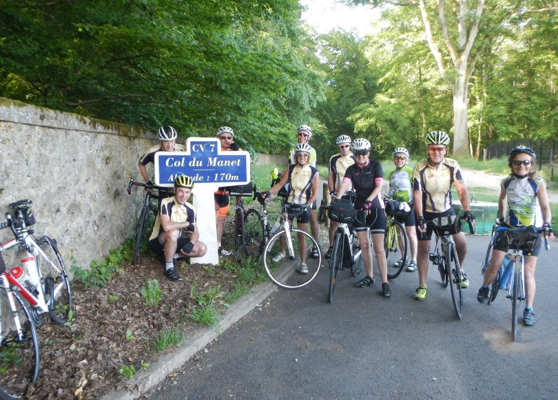 11 cyclos ont participé à la Monticyclo, organisée par le club de Montigny-Le-Bretonneux. C’est notre première organisation de l’année et c’est plein d’enthousiasme que nous nous élançons sur le 100km. A peine avons-nous démarré que nous franchissons le col du Manet, altitude 170mètres ! Bien curieux col !!! Une photo souvenir s’impose… Nous traversons le très agréable massif forestier de Rambouillet, enchaînons la traversée d’agréables villages où notre regard est capté par un château, une belle demeure, une succession de rhododendrons en fleurs, des pâturages de chevaux ou vaches… Nous arrivons à mi-parcours au point de ravitaillement plutôt frugal (la crise sanitaire aurait-elle annihilé les relations humaines ???) et nous prenons le chemin du retour. La météo est nuageuse et semble menaçante au loin. Après la chaleur de ces derniers jours, cela nous surprend. Au moins, nous ne souffrons pas de la chaleur. Il nous faut être plus prudent, la circulation sur les routes empruntées est plus importante. Le groupe est soudé et nous roulons à la même allure, toujours dans une très bonne ambiance. Arrivés à Montigny-Le-Bretonneux, nous discutons autour d’un sandwich et d’une boisson puis chacune/chacun repart sur Auvers. Au total, 101 kilomètres parcourus avec à la clé, le brevet fédéral de 100km ! Une bien agréable journée passée ensemble qui nous a permis de « sortir de nos terres ».