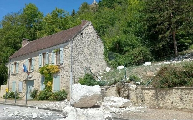 Après1/2h de marche, nous voici à Haute Isle où nous venions découvrir l’église troglodyte creusée dans la falaise de craie. Mais une 1ère curiosité nous arrête, un nouveau lieu-dit “ la Grosse Pierre “ est né le 25 juillet 2022, jour où un mégalithe géant a dévalé la pente. La mairie et un riverain né sous la bonne étoile seront miraculeusement épargnés…