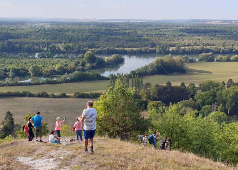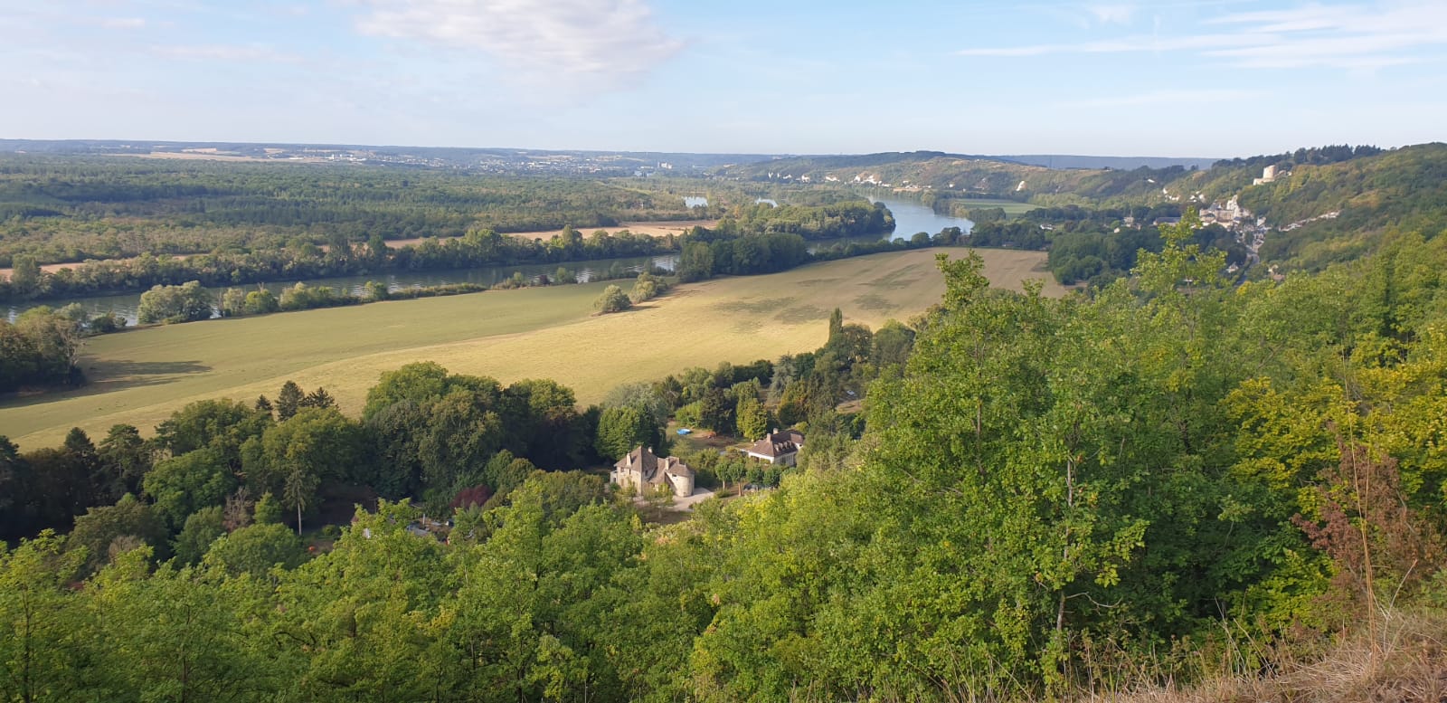 Puis retour sur le GR2 et après quelques bonnes grimpettes, nous faisons la pause-café à un endroit offrant une magnifique vue sur un méandre de la Seine et sur le château de la Roche Guyon.